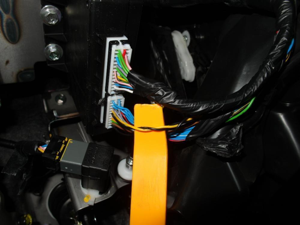 после удаления старой сигнализации была сделана методом отключения ей от штатной проводки. Она была подключена вся в левом пороге, провода штатная была не обрезанная.